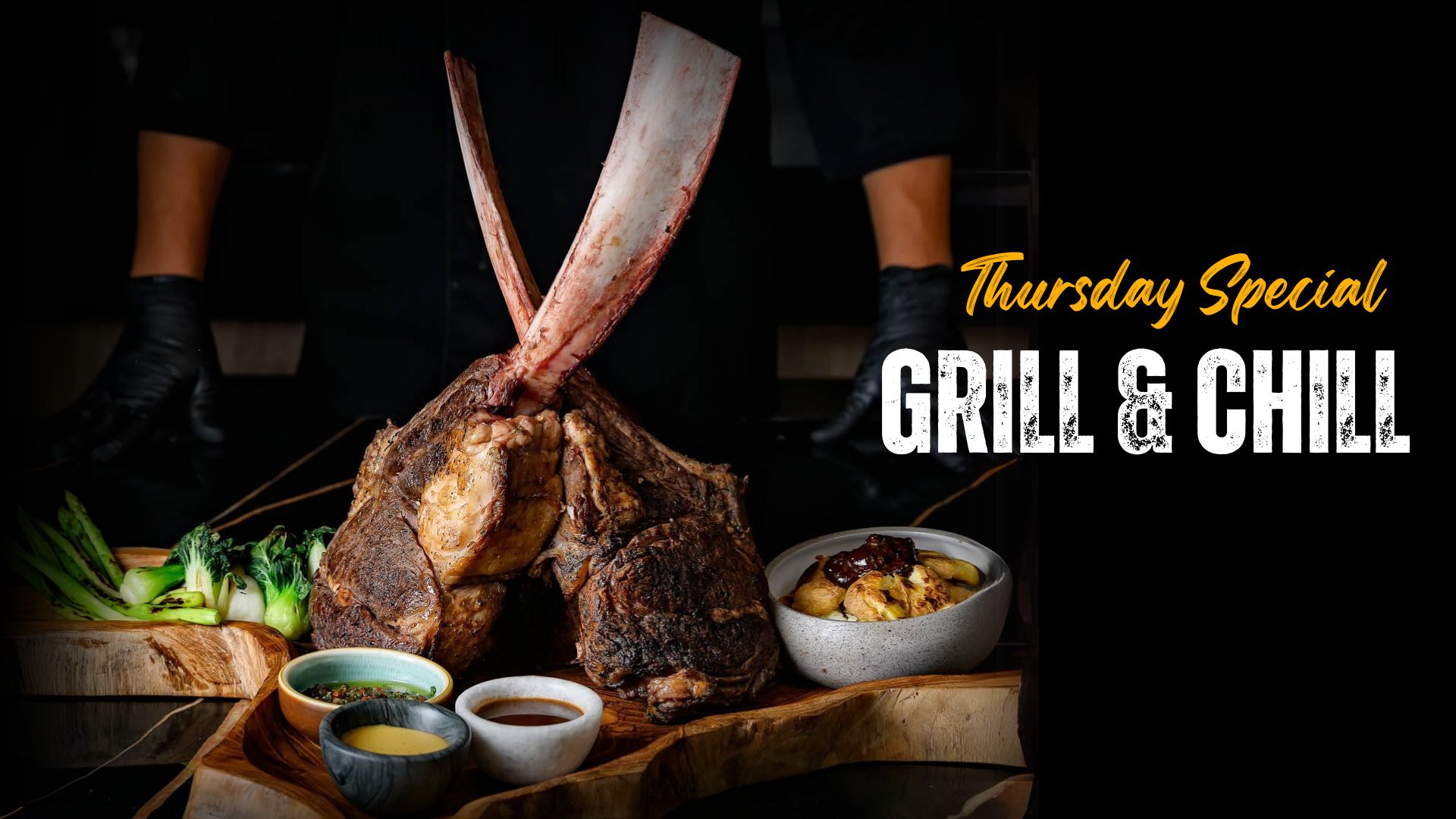 Fire up your Thursday evenings with our Tomahawk & Wine Night. Perfect for sharing, indulge in a 1.2 kg Tomahawk steak grilled to perfection, served with two sides and two sauces, paired with a bold glass of red wine.